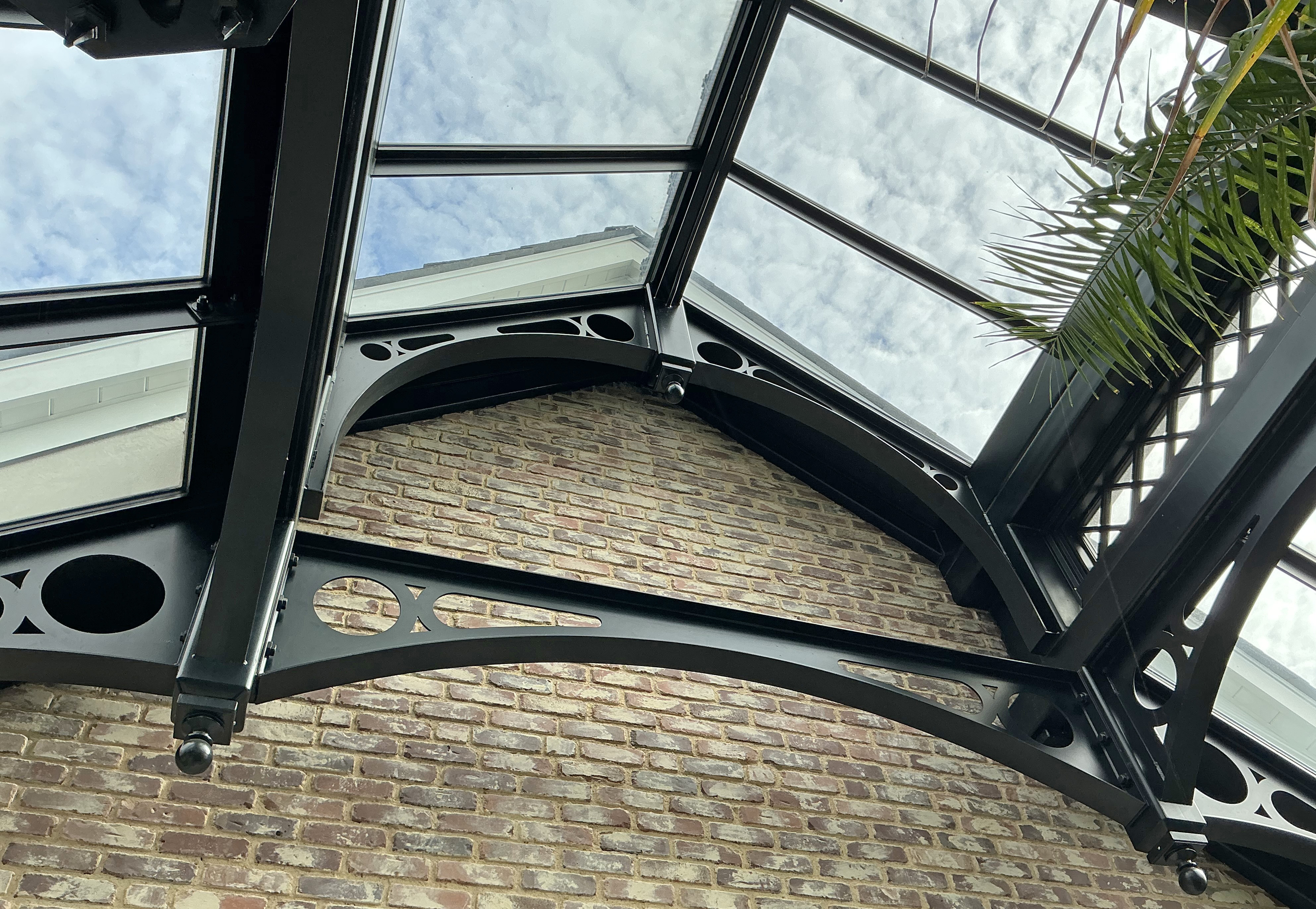 But the vintage-looking structure is authentic. Gently arched steel trusses and forged steel elements soften the interior, corroborating the organic forms of the greenery. The geometry of the traditional “crossing gothic” tracery in the windows is a counterpoint to the freedom expressed by the plant life. Castings and traditional elements such as pilasters and crown mouldings are sensitively included.