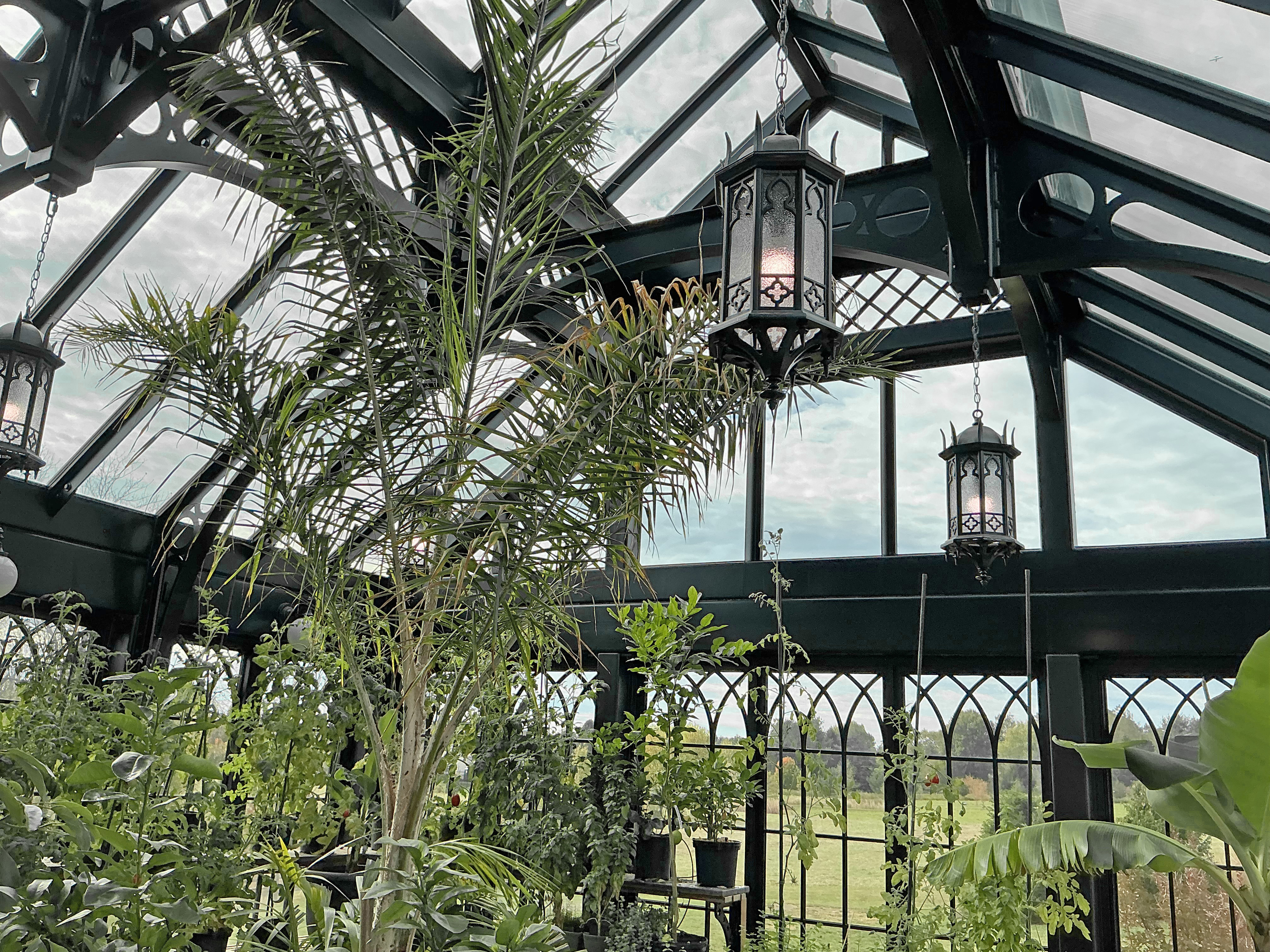 Antique hanging lanterns add to the ambiance. What better place to spend a snowy winter’s day than this warm, fragrant oasis filled with thriving friends?